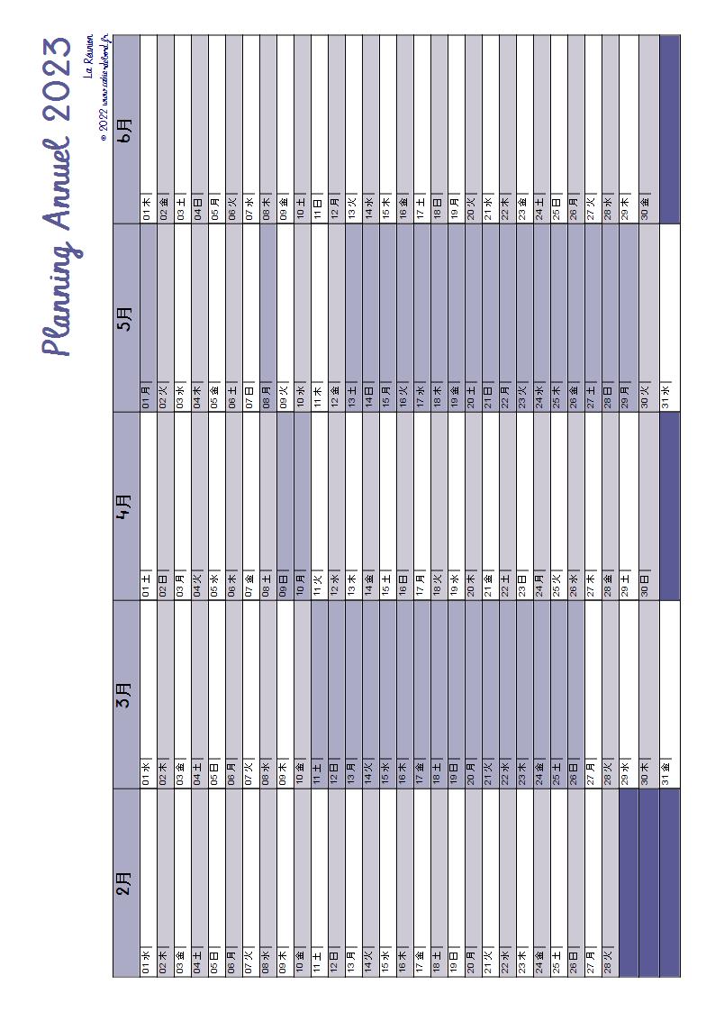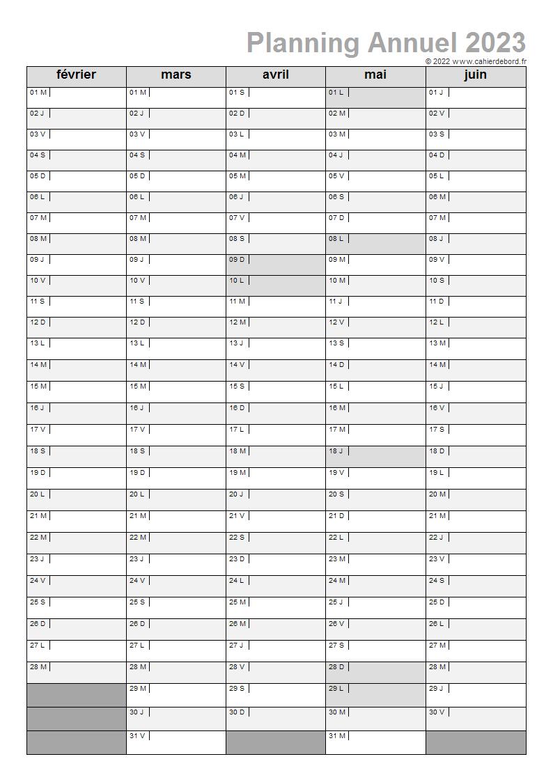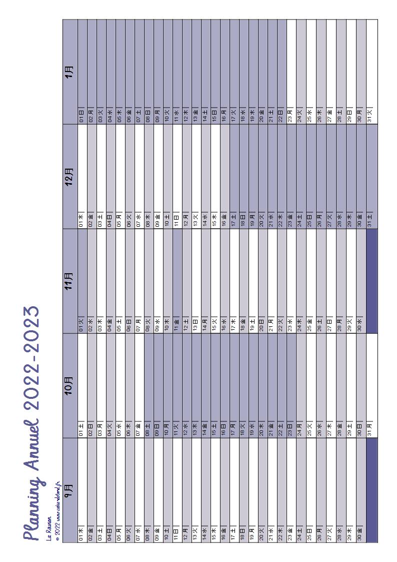 Planning annuel de septembre 2022 à juin 2023 sur une double page adaptable à chaque zone scolaire.